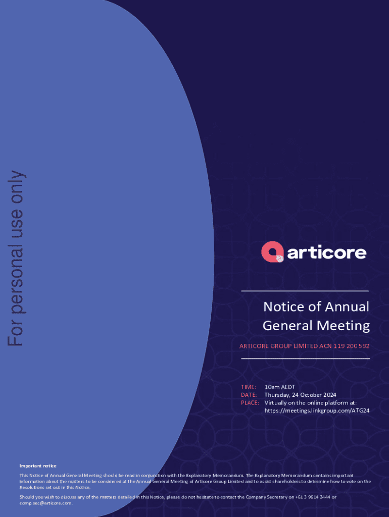 This document is a notice for the Annual General Meeting (AGM) of Articore Group Limited scheduled for October 24, 2024. It contains details about the meeting including resolutions for voting, important information for shareholders, voting eligibility criteria, and procedures. The resolutions include the appointment of directors, approval of director participation in the Equity Incentive Plan, and the adoption of the remuneration report, among others.