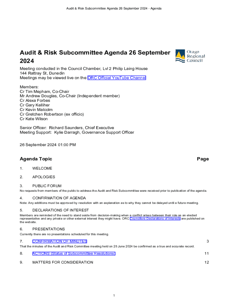 Audit & Risk Subcommittee Agenda 26 September 2024 AgendaAudit & Risk Subcommittee Agenda 26 September 2024 Meeting conducted in the Council Chamber, Lvl 2 Philip Laing House 144 Rattray St, Dunedin