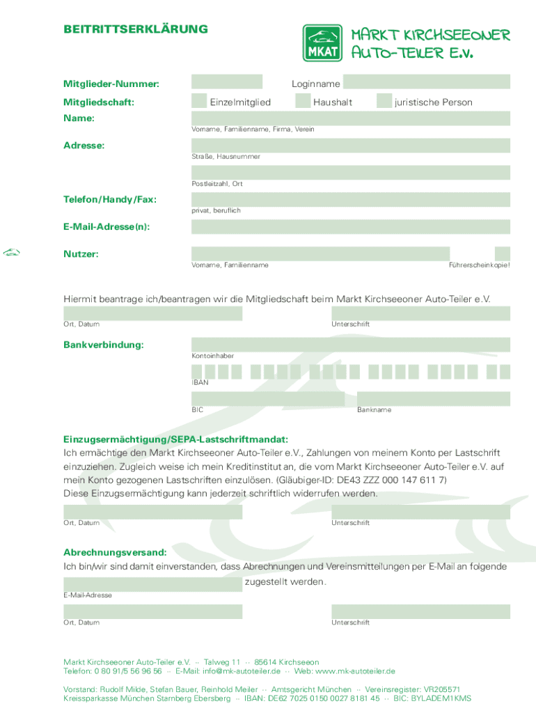 BeitrittserklrungMitgliederNummer:LoginnameMitgliedschaft:EinzelmitgliedHaushaltjuristische PersonName: Vorname, Familienname, Firma, VereinAdresse: Strae, HausnummerPostleitzahl, OrtTelefon/Handy/Fax: