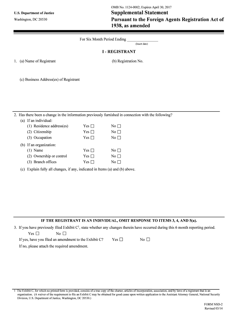 OMB No. 1124-0002; Expires April 30, 2017, U.S. Department of Justice Washington, DC 20530 Supplemental Statement Pursuant to the Foreign Agents Registration Act of 1938, as amended INSTRUCTION SHEET-READ