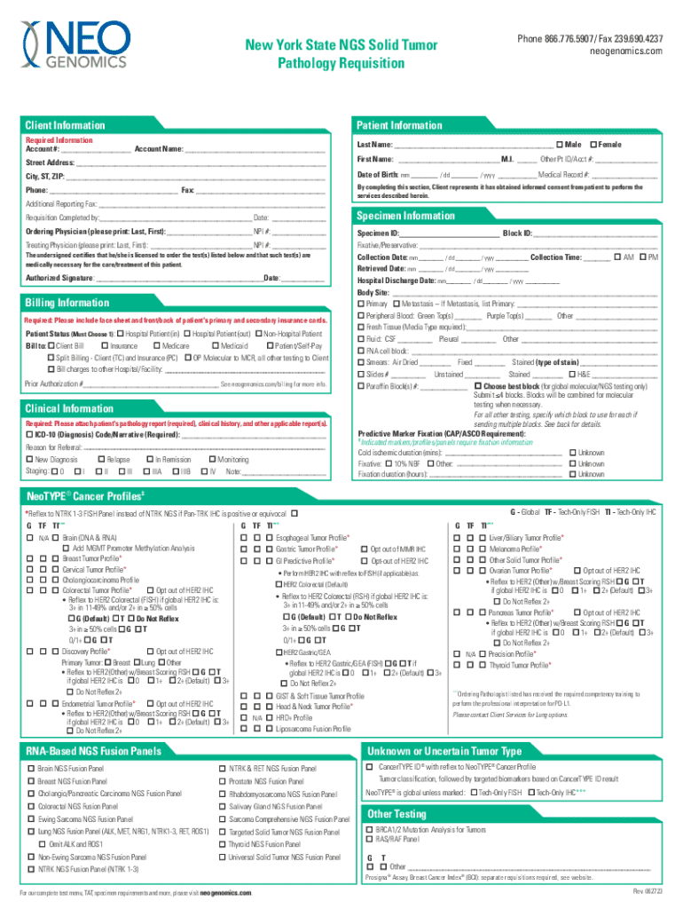 Phone 866.776.5907/ Fax 239.690.4237 neogenomics.comNew York State NGS Solid Tumor Pathology RequisitionClient InformationPatient InformationRequired Information Account #: ___ Account Name: ___Last