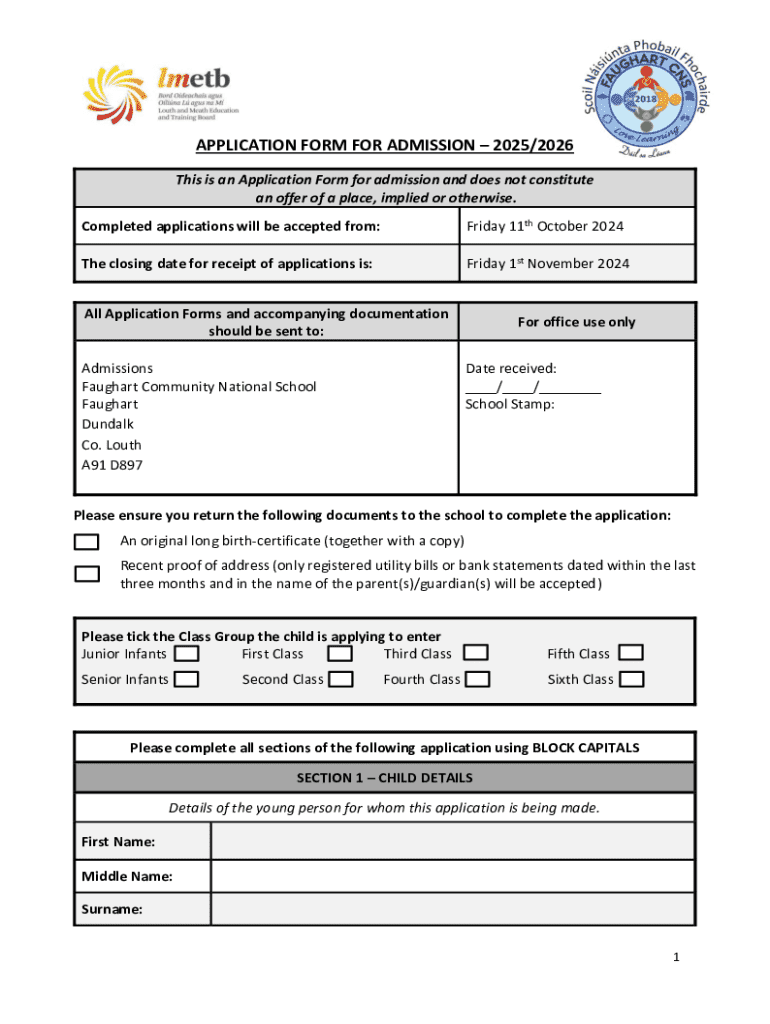 APPLICATION FORM FOR ADMISSION 2025/2026 This is an Application Form for admission and does not constitute an offer of a place, implied or otherwise. Completed applications will be accepted from:Friday