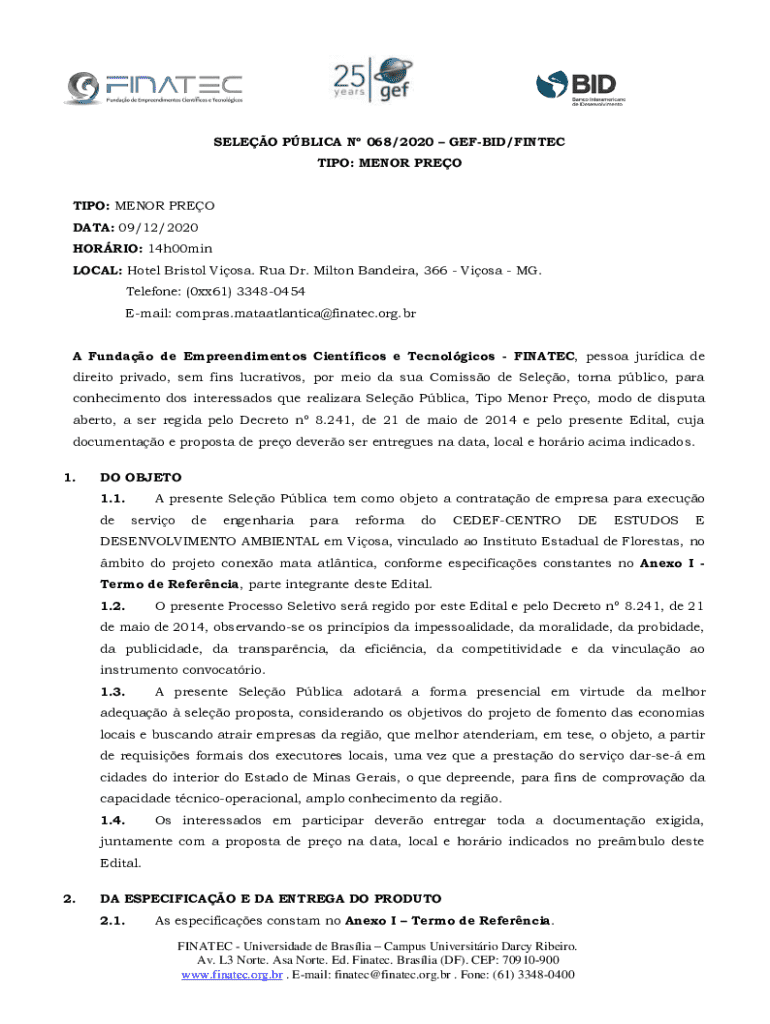SELEO PBLICA N 068/2020 GEFBID/FINTEC TIPO: MENOR PREO TIPO: MENOR PREO DATA: 09/12/2020 HORRIO: 14h00min LOCAL: Hotel Bristol Viosa. Rua Dr. Milton Bandeira, 366 Viosa MG. Telefone: (0xx61) 33480454