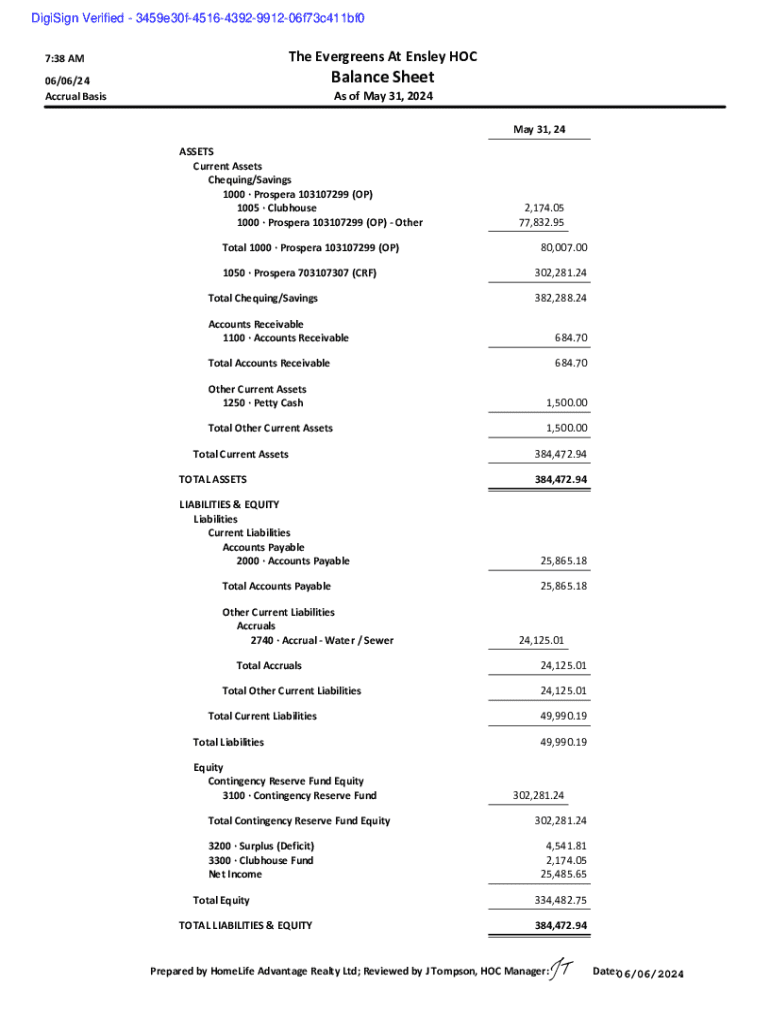 DigiSign Verified 3459e30f45164392991206f73c411bf0The Evergreens At Ensley HOC7:38 AMBalance Sheet06/06/24 Accrual BasisAs of May 31, 2024May 31, 24 ASSETS Current Assets Chequing/Savings 1000 Prospera