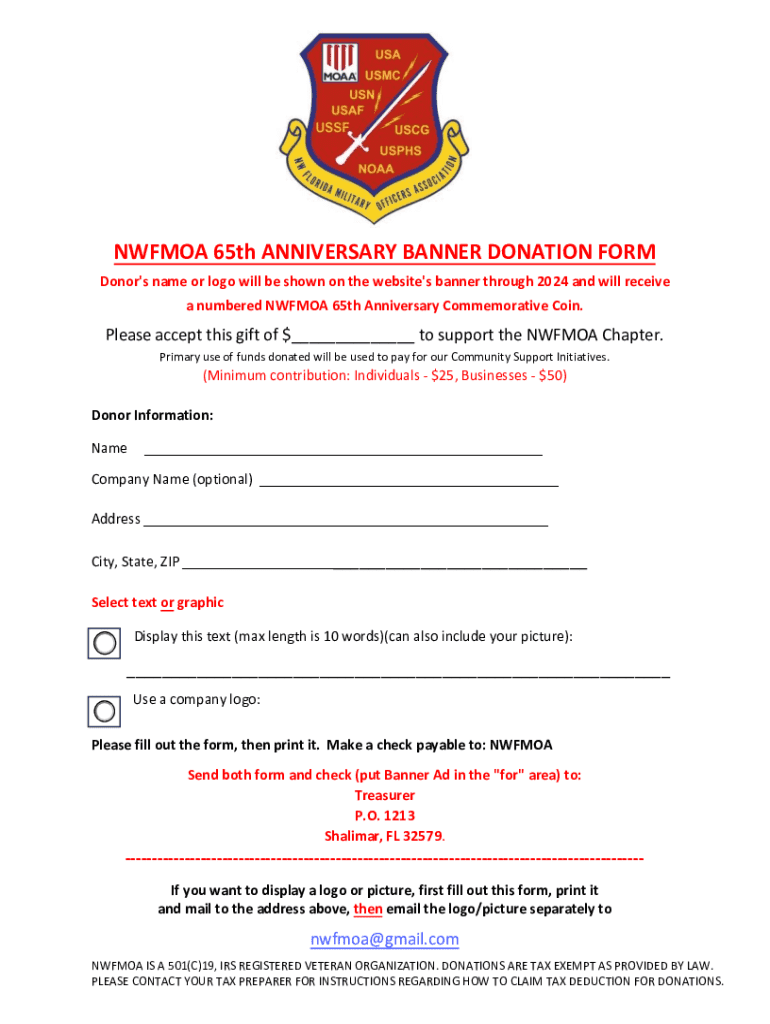This form allows donors to contribute to the NWFMOA for a banner display on the website for the 65th anniversary. Donors will receive a commemorative coin and their name or logo will be shown on the banner for the year 2024.