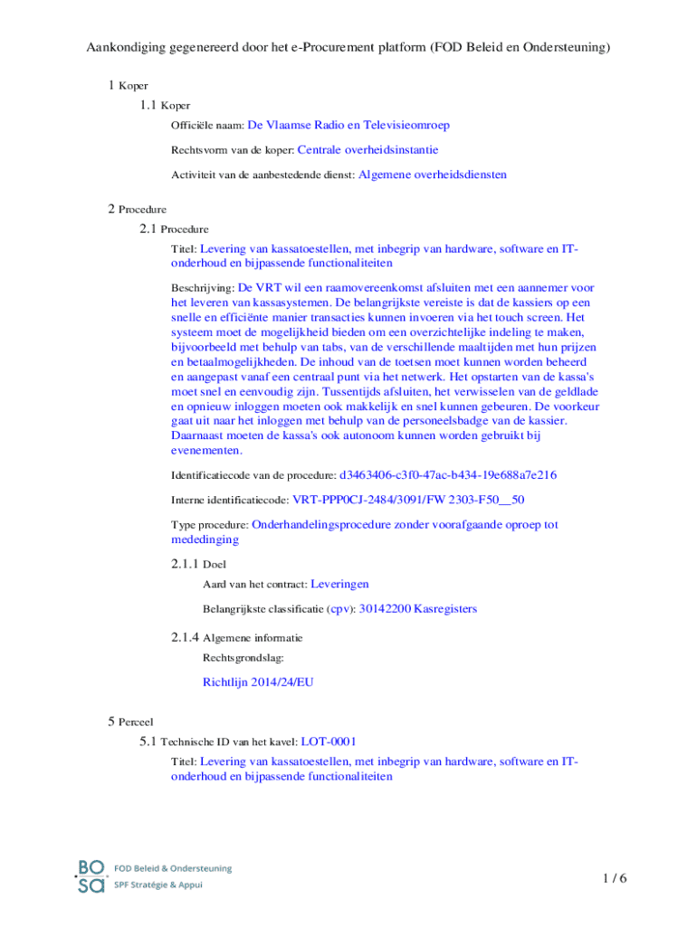 Aankondiging gegenereerd door het eProcurement platform (FOD Beleid en Ondersteuning) 1 Koper 1.1 Koper Officile naam: De Vlaamse Radio en Televisieomroep Rechtsvorm van de koper: Centrale overheidsinstantie