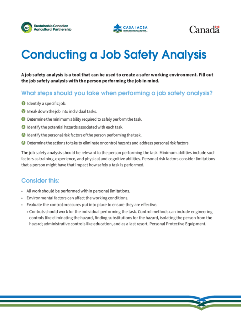 Conducting a Job Safety Analysis A job safety analysis is a tool that can be used to create a safer working environment. Fill out the job safety analysis with the person performing the job in mind.What