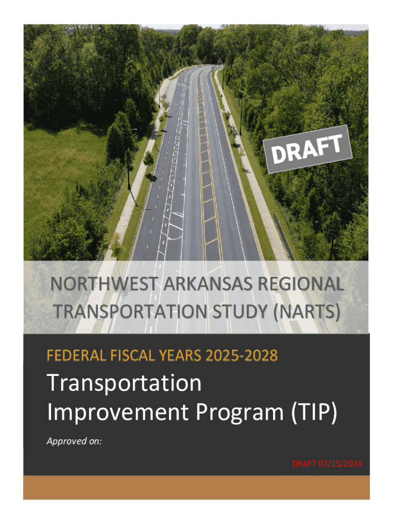 This document outlines the Transportation Improvement Program (TIP) for Northwest Arkansas, spanning the federal fiscal years 2025 to 2028. It includes information on planned transportation projects, funding sources, project descriptions, and goals in compliance with federal regulations. The TIP is designed to facilitate a comprehensive, multi-modal transportation system that meets the needs of the growing urbanized area of Northwest Arkansas.