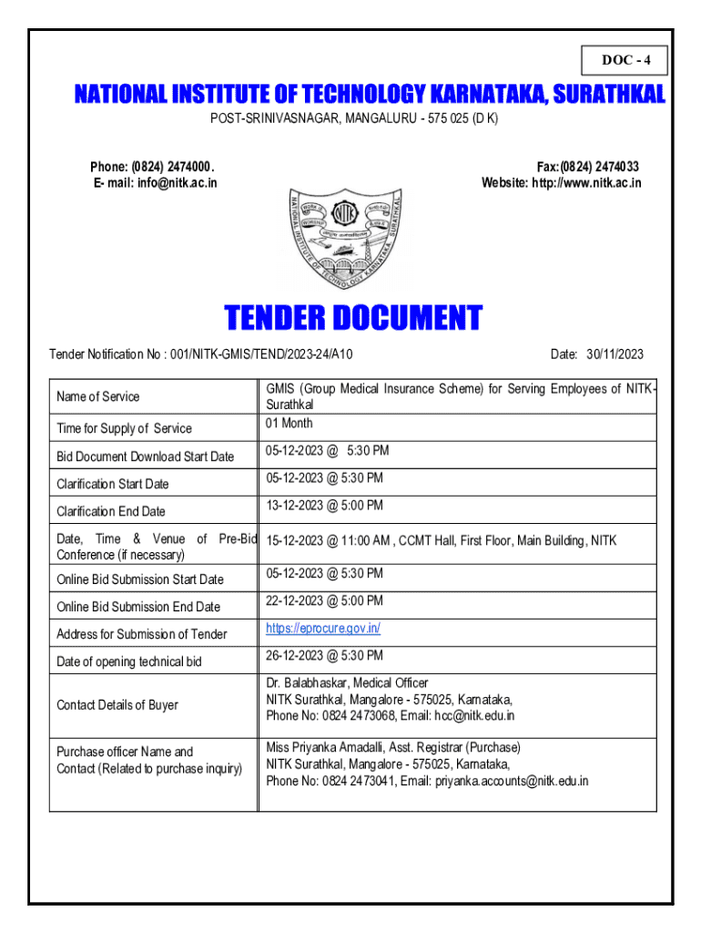 DOC 4POSTSRINIVASNAGAR, MANGALURU 575 025 (D K) Phone: (0824) 2474000. E mail: info@nitk.ac.inFax:(0824) 2474033 Website: http://www.nitk.ac.inTender Notification No : 001/NITKGMIS/TEND/202324/A10Date: