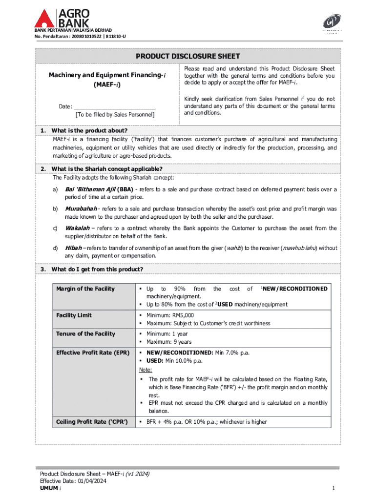 BANK PERTANIAN MALAYSIA BERHAD No. Pendaftaran : 200801010522 | 811810UPRODUCT DISCLOSURE SHEET1.Machinery and Equipment Financingi (MAEFi)Please read and understand this Product Disclosure Sheet
