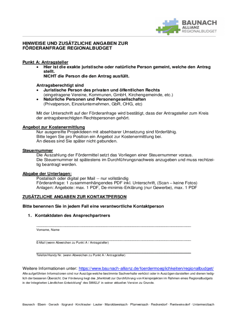 HINWEISE UND ZUSTZLICHE ANGABEN ZUR FRDERANFRAGE REGIONALBUDGET Punkt A: Antragsteller Hier ist die exakte juristische oder natrliche Person gemeint, welche den Antrag stellt. NICHT die Person die