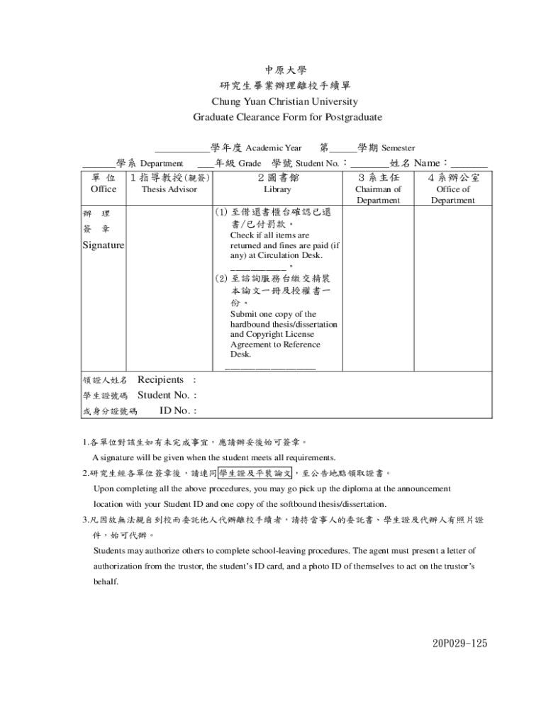 This document outlines the procedures and requirements for postgraduate students at Chung Yuan Christian University to complete their clearance process before graduation. It details the necessary signatures from various departments, submission of thesis, and options for students who cannot complete the process in person.