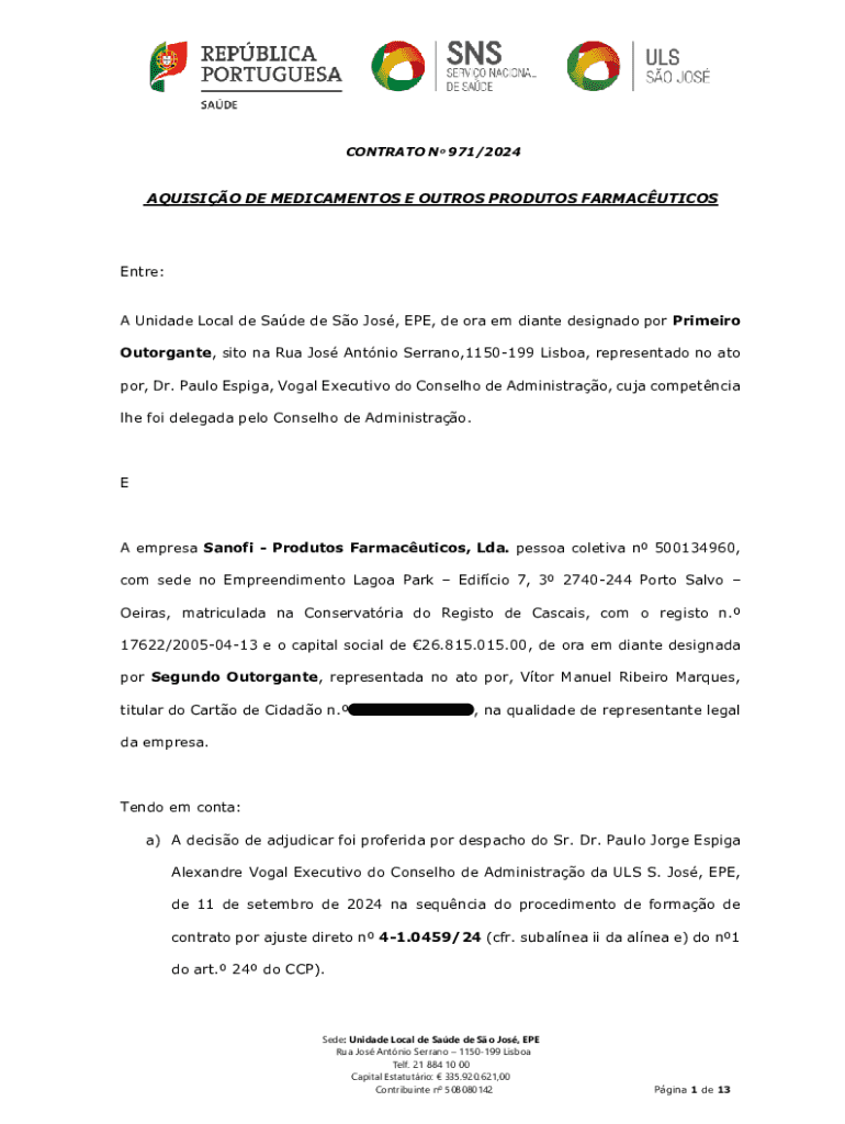 CONTRATO N 971/2024AQUISIO DE MEDICAMENTOS E OUTROS PRODUTOS FARMACUTICOSEntre: A Unidade Local de Sade de So Jos, EPE, de ora em diante designado por Primeiro Outorgante, sito na Rua Jos Antnio Serrano,1150199