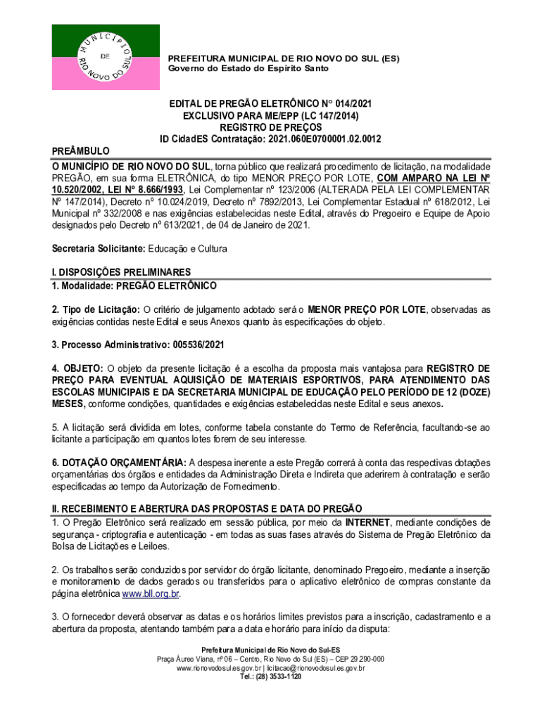PREFEITURA MUNICIPAL DE RIO NOVO DO SUL (ES) Governo do Estado do Esprito SantoEDITAL DE PREGO ELETRNICO N 014/2021 EXCLUSIVO PARA ME/EPP (LC 147/2014) REGISTRO DE PREOS ID CidadES Contratao: 2021.060E0700001.02.0012