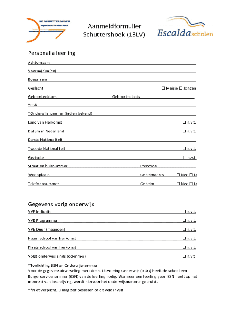 Aanmeldformulier Schuttershoek (13LV) Personalia leerling Achternaam Voorna(a)m(en) Roepnaam Meisje JongenGeslacht GeboortedatumGeboorteplaats___*BSN *Onderwijsnummer (indien bekend) Land van Herkomst
