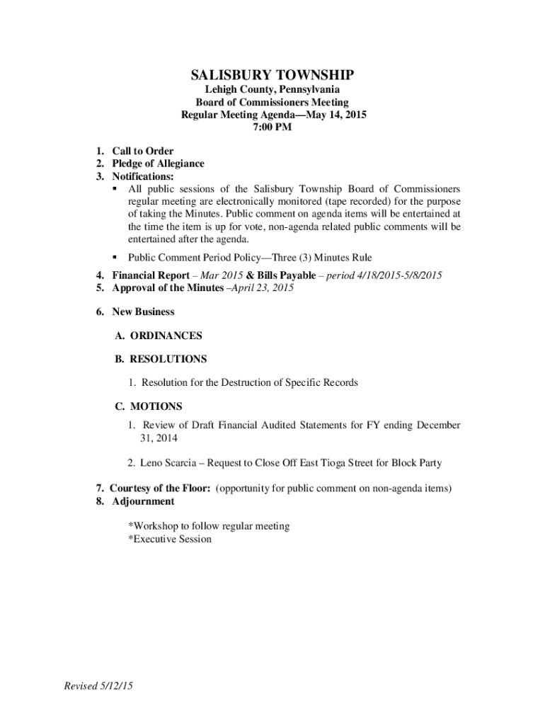This document outlines the agenda for the Salisbury Township Board of Commissioners regular meeting, including call to order, pledge of allegiance, financial reports, approval of minutes, new business including ordinances, resolutions, and motions, public comment periods, and adjournment details.
