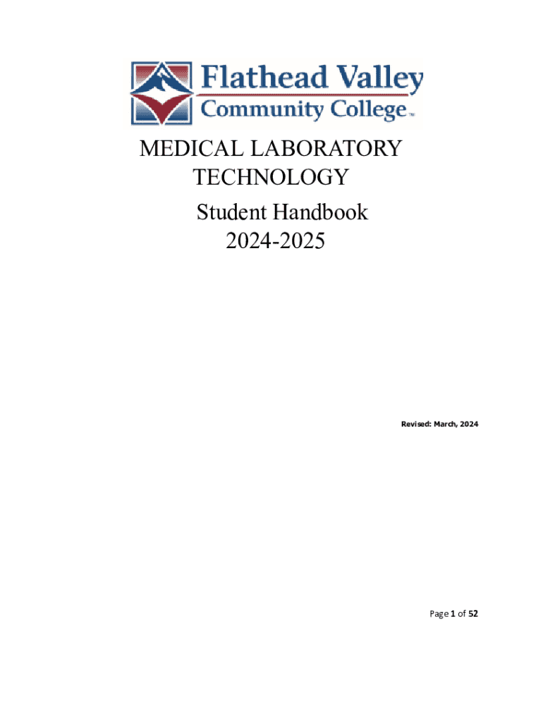 MEDICAL LABORATORY TECHNOLOGY Student Handbook 20242025Revised: March, 2024Page 1 of 52Table of Contents INTRODUCTION AND WELCOME...........................................................................................................................4