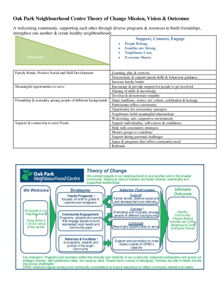 Oak Park Neighbourhood Centre Theory of Change Mission, Vision & Outcomes A welcoming community, supporting each other through diverse programs & resources to build friendships, strengthen one another