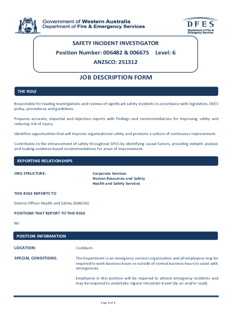SAFETY INCIDENT INVESTIGATOR Position Number: 006482 & 006675Level: 6ANZSCO: 251312JOB DESCRIPTION FORM THE ROLE Responsible for leading investigations and reviews of significant safety incidents