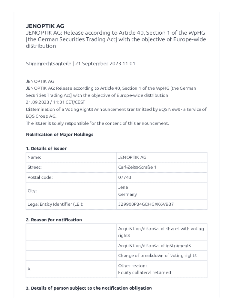 JENOPTIK AG JENOPTIK AG: Release according to Article 40, Section 1 of the WpHG [the German Securities Trading Act] with the objective of Europewide distribution Stimmrechtsanteile | 21 September
