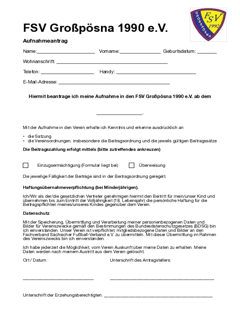 FSV Gropsna 1990 e.V. Aufnahmeantrag Name:___ Vorname:___ Geburtsdatum: ___ Wohnanschrift: ___ Telefon: ___Handy: ___EMailAdresse: ___ Hiermit beantrage ich meine Aufnahme in den FSV Gropsna 1990