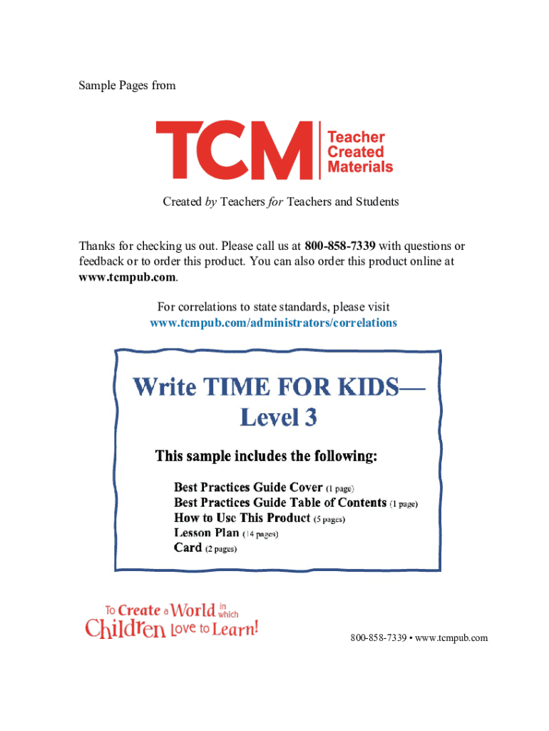 This guide provides best practices for using the Write TIME for Kids program, which aims to enhance students\' writing skills through various instructional strategies, including the writing process, mentor texts, and assessment practices. It includes lesson plans, assessment tools, and differentiated instruction strategies to support diverse learners.