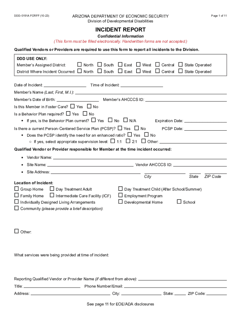 This document is an Incident Report form used by the Arizona Department of Economic Security\'s Division of Developmental Disabilities. It is a confidential form required for Qualified Vendors or Providers to report incidents involving members. The report captures essential details regarding the incident, including the date, time, member information, incident type (medication, death, or other), and any actions taken. It is necessary to complete this form electronically and submit it within...