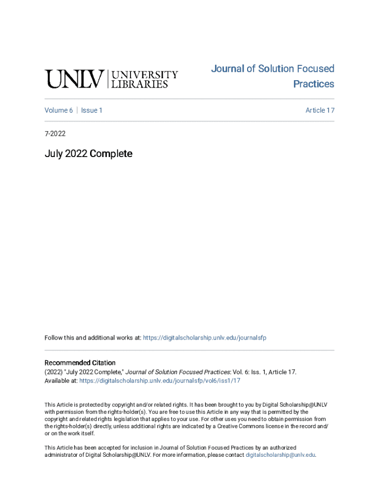 Journal of Solution Focused Practices Volume 6Issue 1Article 1772022July 2022 CompleteFollow this and additional works at: https://digitalscholarship.unlv.edu/journalsfpRecommended Citation (2022)