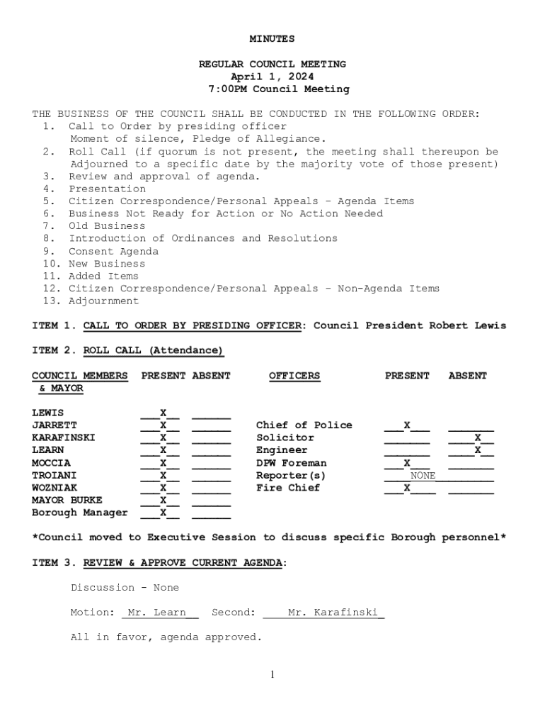 MINUTES REGULAR COUNCIL MEETING April 1, 2024 7:00PM Council Meeting THE BUSINESS OF THE COUNCIL SHALL BE CONDUCTED IN THE FOLLOWING ORDER: 1. Call to Order by presiding officer Moment of silence,