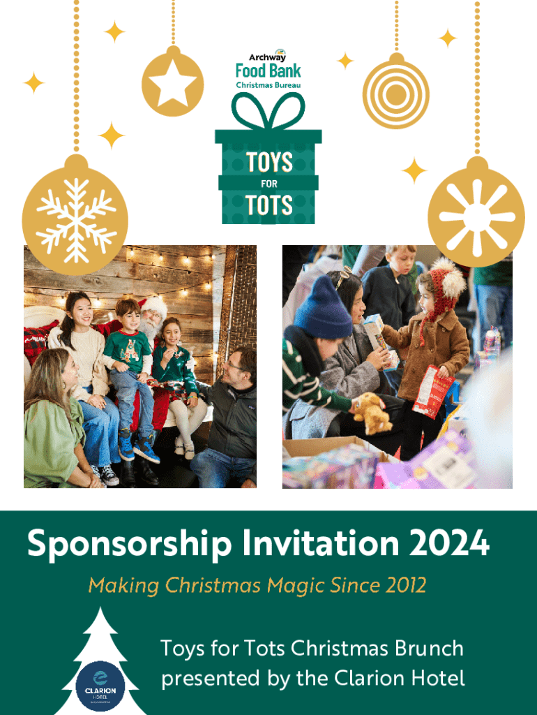 An invitation to sponsor the 12th annual Toys for Tots Christmas Brunch, presented by the Clarion Hotel. The event aims to gather toys and donations for children in need, featuring live entertainment, food, and a visit from Santa, while promoting community generosity.