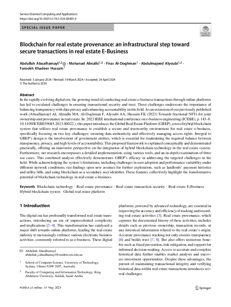 Service Oriented Computing and Applications https://doi.org/10.1007/s11761024004030SPECIAL ISSUE PAPERBlockchain for real estate provenance: an infrastructural step toward secure transactions in real