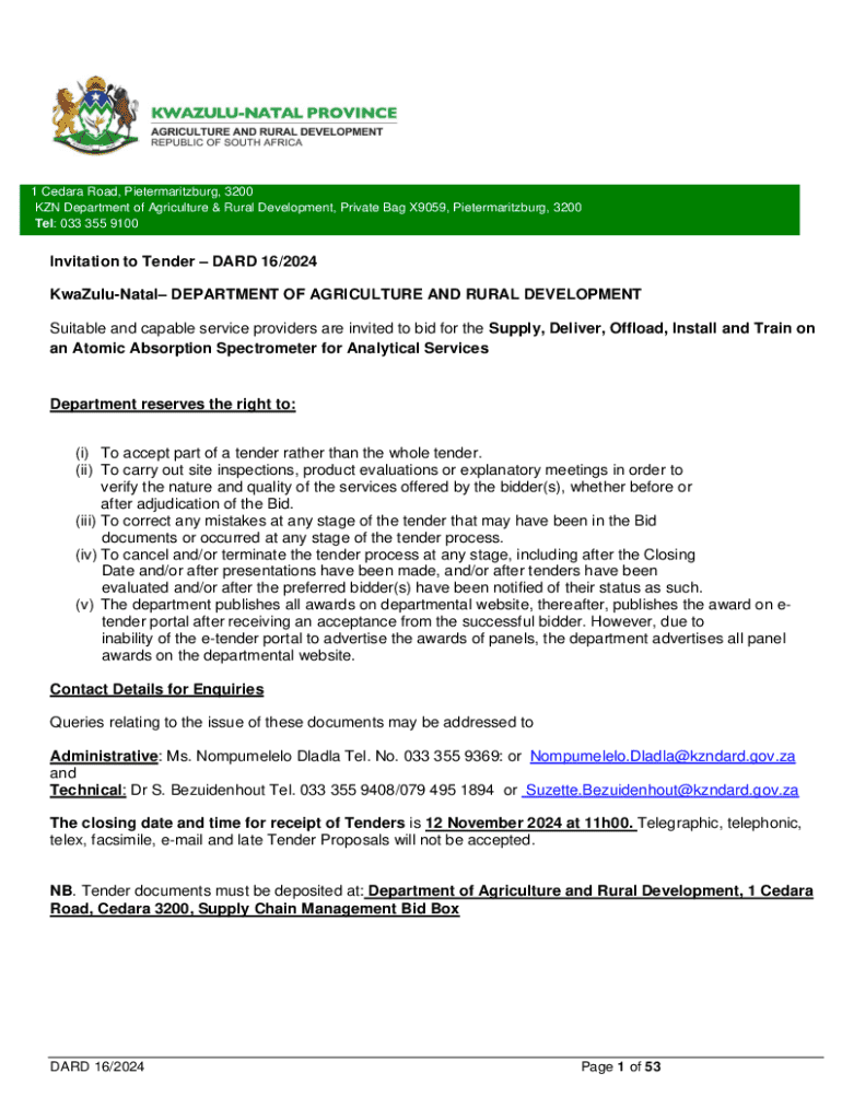 1 Cedara Road, Pietermaritzburg, 3200 KZN Department of Agriculture & Rural Development, Private Bag X9059, Pietermaritzburg, 3200 Tel: 033 355 9100Invitation to Tender DARD 16/2024 KwaZuluNatal DEPARTMENT