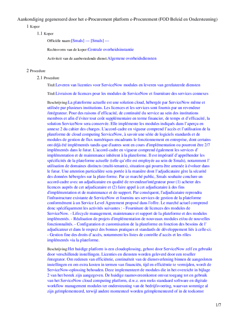 Aankondiging gegenereerd door het eProcurement platform eProcurement (FOD Beleid en Ondersteuning) 1 Koper 1.1 Koper Officile naam:[Smals] [Smals] Rechtsvorm van de koper:Centrale overheidsinstantie