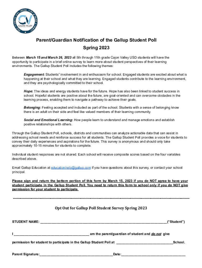 Parent/Guardian Notification of the Gallup Student Poll Spring 2023 Between March 15 and March 26, 2023 all 5th through 11th grade Cajon Valley USD students will have the opportunity to participate