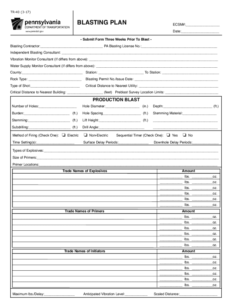 BLASTING PLANTR40 (317)www.penndot.govECSM#:___ Date:___ Submit Form Three Weeks Prior To Blast Blasting Contractor:___ PA Blasting License No.:___Independent Blasting Consultant: ___Vibration Monitor