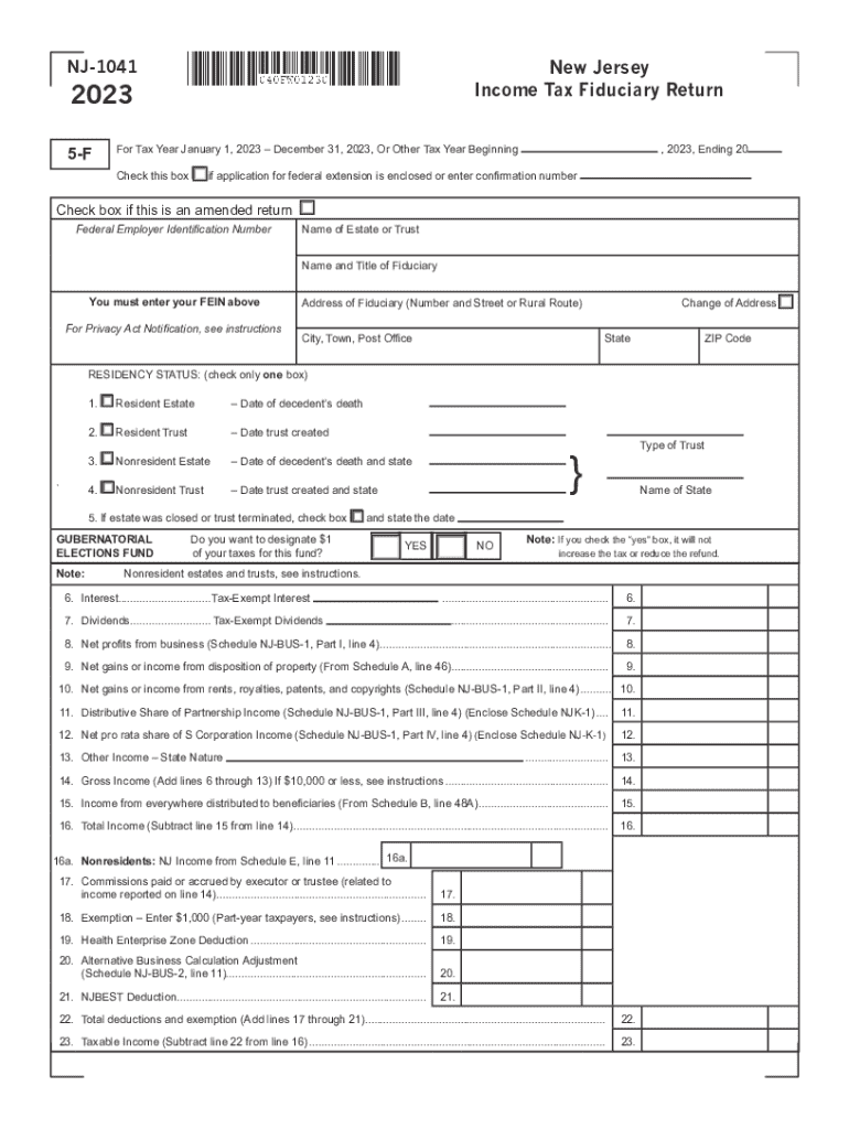 The NJ-1041 form is used for filing the New Jersey Income Tax Fiduciary Return for estates and trusts for the tax year 2023. This document includes sections for reporting income, deductions, and calculating the balance of tax due or overpayment. It also allows fiduciaries to designate tax contributions to the gubernatorial elections fund and captures essential estate or trust information, including residency status.