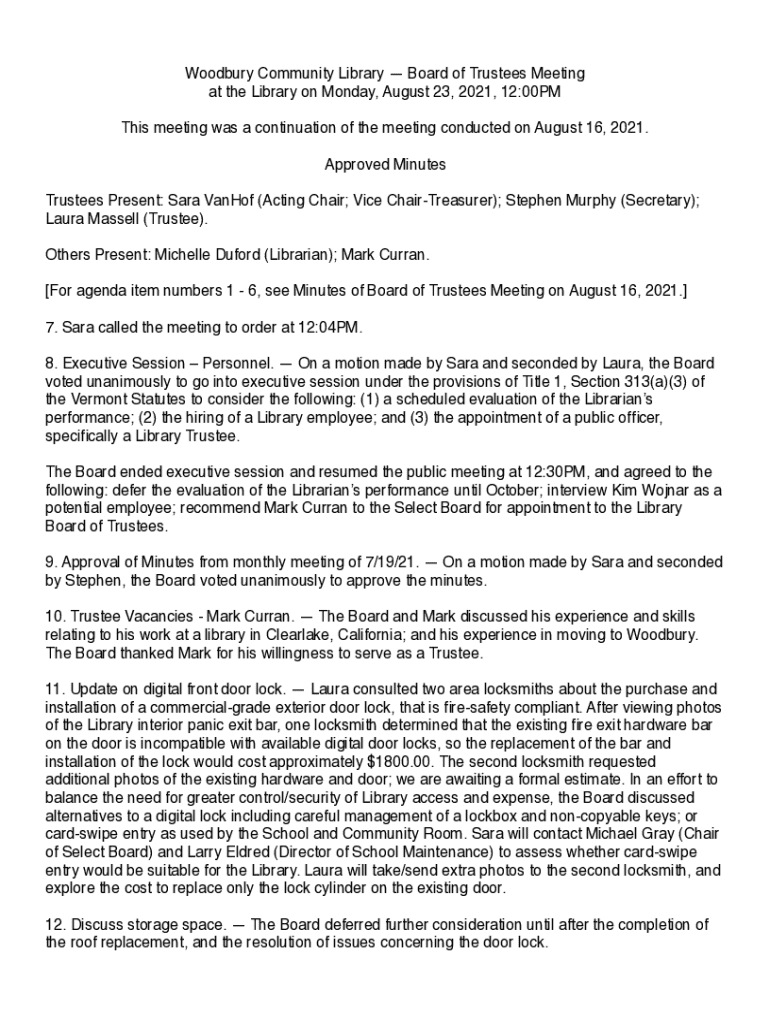 Minutes from the Woodbury Community Library Board of Trustees meeting held on August 23, 2021, discussing various agenda items including personnel evaluations, trustee appointments, library policies, and grant applications.