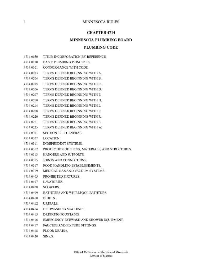 1MINNESOTA RULES CHAPTER 4714 MINNESOTA PLUMBING BOARD PLUMBING CODE4714.0050TITLE; INCORPORATION BY REFERENCE.4714.0100BASIC PLUMBING PRINCIPLES.4714.0101CONFORMANCE WITH CODE.4714.0203TERMS DEFINED