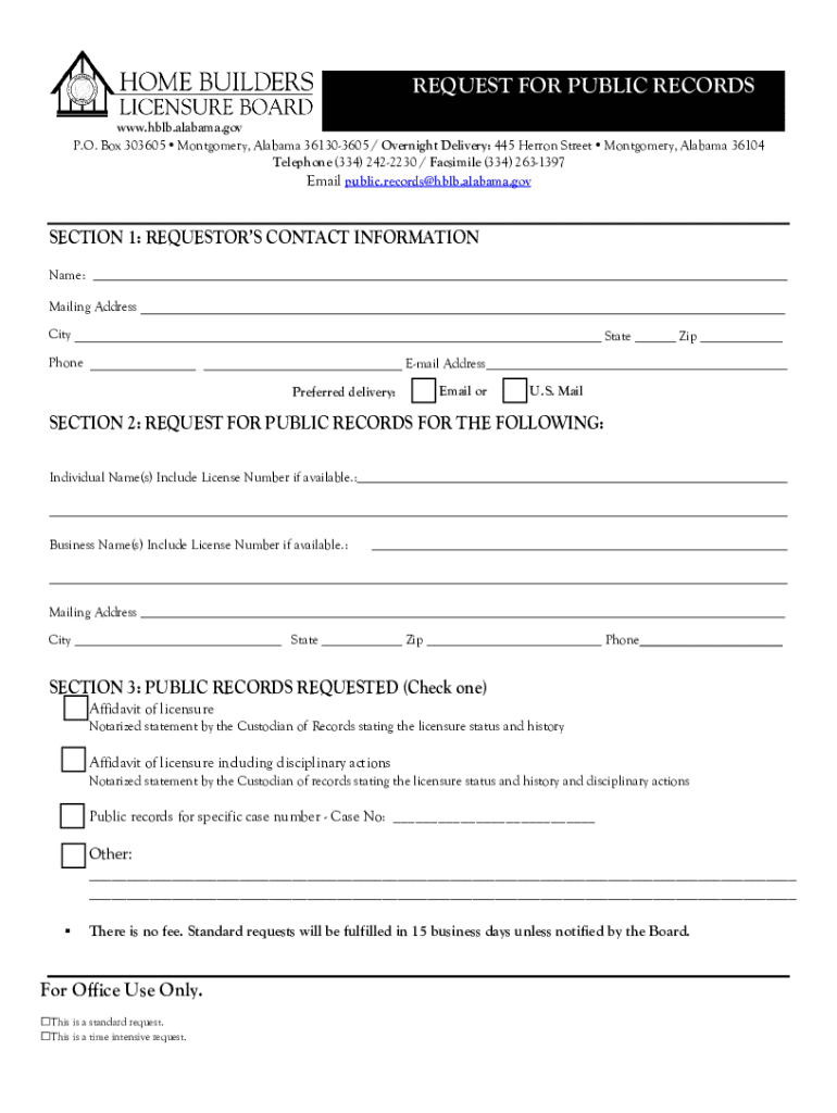 REQUEST FOR PUBLIC RECORDS www.hblb.alabama.gov P.O. Box 303605 Montgomery, Alabama 361303605 / Overnight Delivery: 445 Herron Street Montgomery, Alabama 36104 Telephone (334) 2422230 / Facsimile