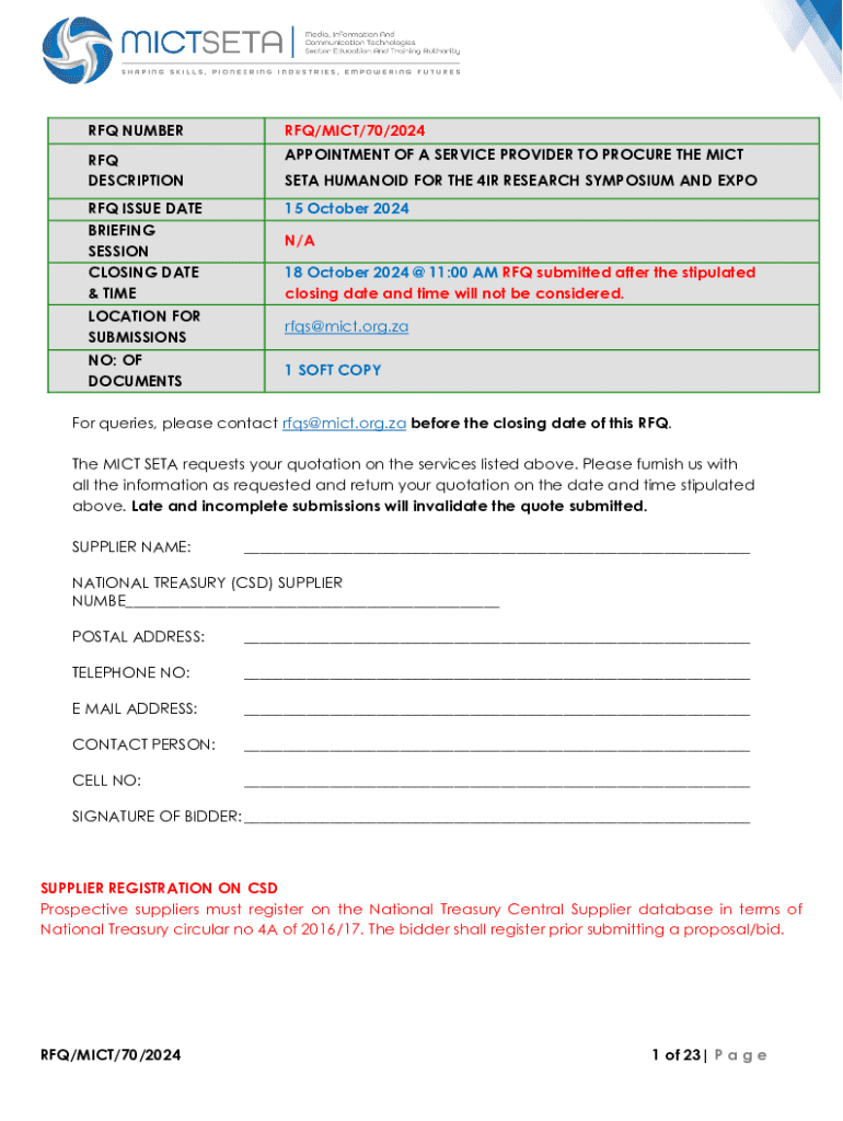 RFQ NUMBERRFQ/MICT/70/2024RFQ DESCRIPTIONAPPOINTMENT OF A SERVICE PROVIDER TO PROCURE THE MICTRFQ ISSUE DATE BRIEFING SESSION CLOSING DATE & TIME15 October 2024SETA HUMANOID FOR THE 4IR RESEARCH SYMPOSIUM