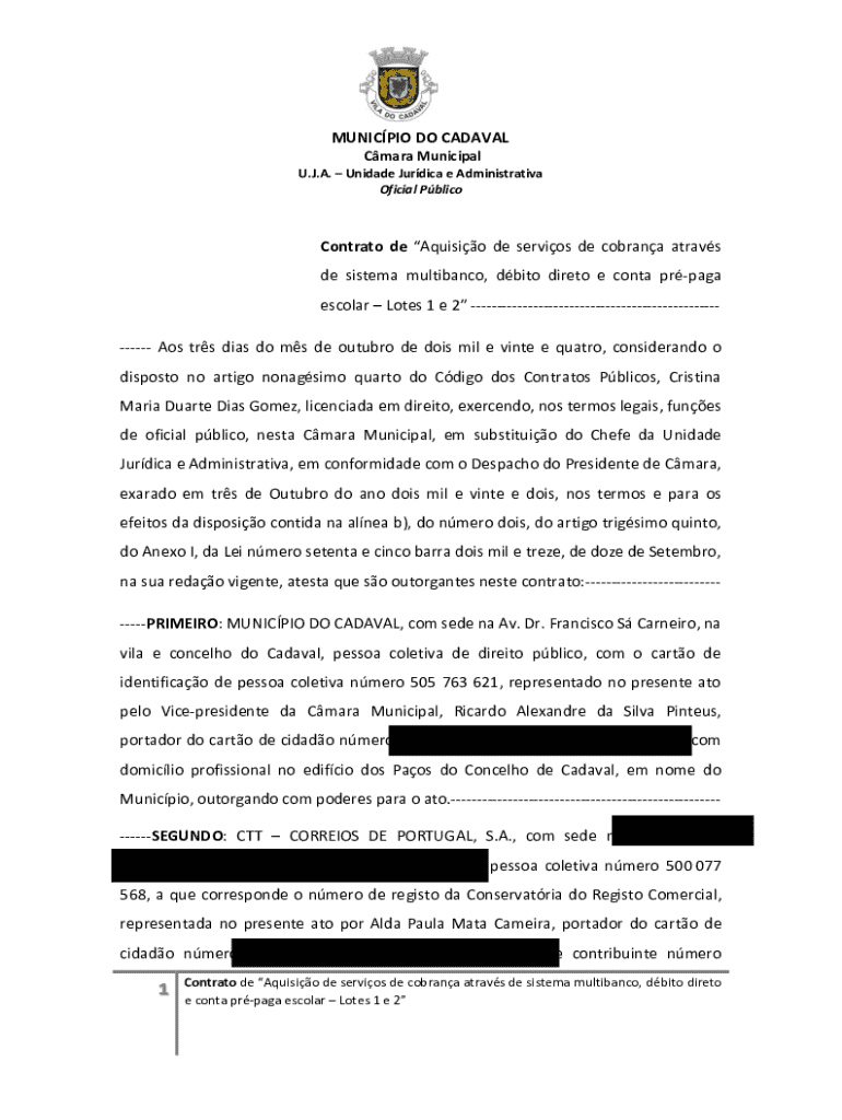 MUNICPIO DO CADAVAL Cmara Municipal U.J.A. Unidade Jurdica e Administrativa Oficial PblicoContrato de Aquisio de servios de cobrana atravs de sistema multibanco, dbito direto e conta prpaga escolar