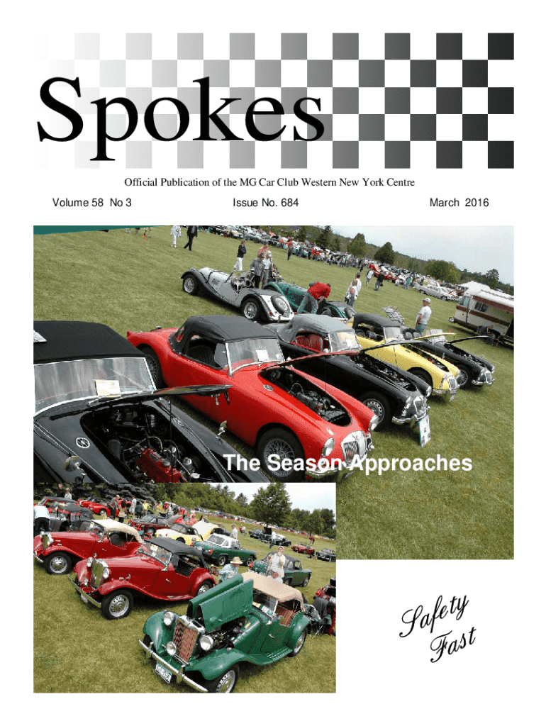 Spokes Official Publication of the MG Car Club Western New York CentreVolume 58 No 3Issue No. 684March 2016The Season Approachesy t e f a S st FaMG CAR CLUB WESTERN NEW YORK CENTRE PO Box 92556, Rochester,