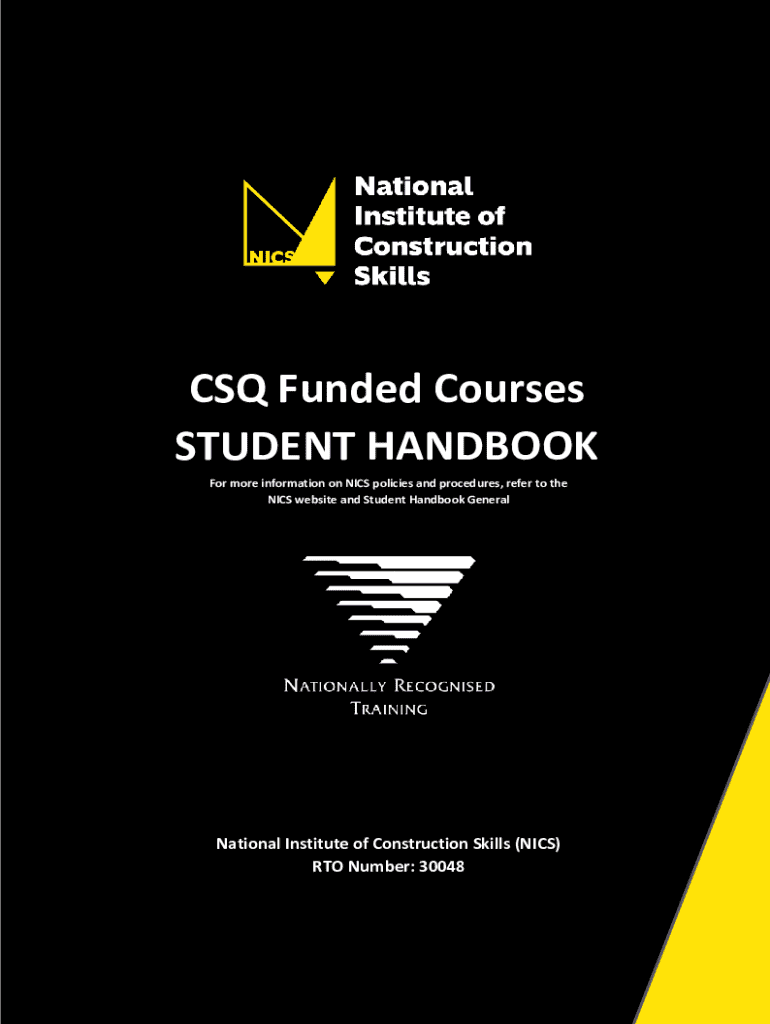 CSQ Funded Courses STUDENT HANDBOOK For more information on NICS policies and procedures, refer to the NICS website and Student Handbook GeneralNational Institute of Construction Skills (NICS) RTO