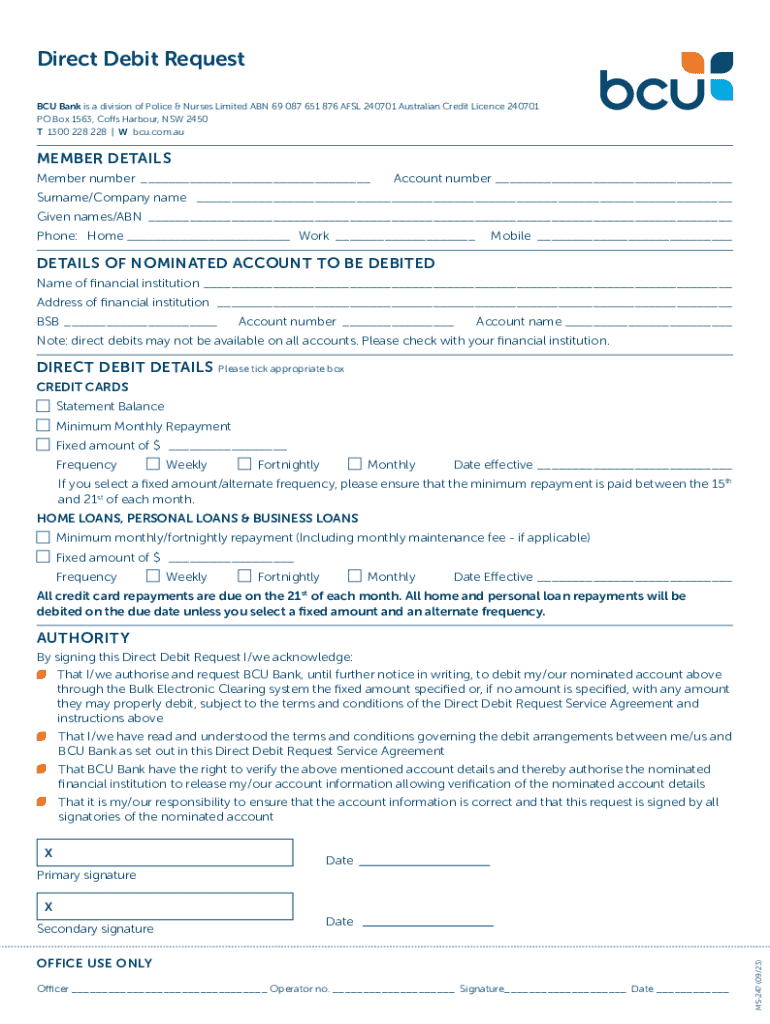 Direct Debit Request BCU Bank is a division of Police & Nurses Limited ABN 69 087 651 876 AFSL 240701 Australian Credit Licence 240701 PO Box 1563, Coffs Harbour, NSW 2450 T 1300 228 228 | W bcu.com.auMEMBER