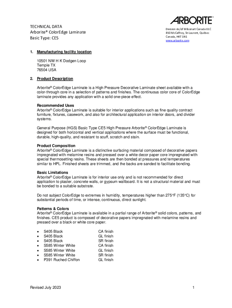This document provides detailed technical specifications, usage guidelines, and maintenance information for Arborite® ColorEdge Laminate, a high-pressure decorative laminate suitable for various interior applications. It includes manufacturing information, product composition, recommended uses, and limitations, along with fire test data and installation recommendations.