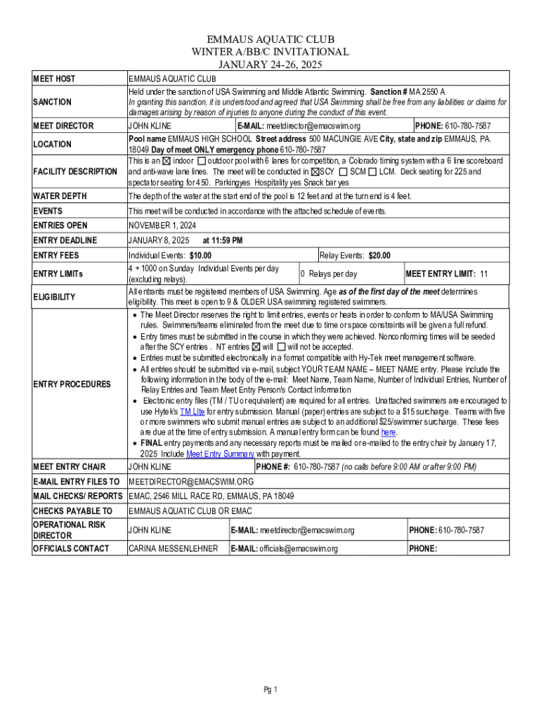 EMMAUS AQUATIC CLUB WINTER A/BB/C INVITATIONAL JANUARY 2426, 2025 MEET HOSTWATER DEPTHEMMAUS AQUATIC CLUB Held under the sanction of USA Swimming and Middle Atlantic Swimming. Sanction # MA 2550 A