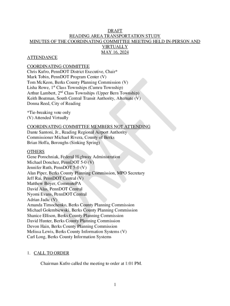 This document outlines the proceedings of the Coordinating Committee meeting held in-person and virtually on May 16, 2024. It includes attendance details, introductions of new members, motions for approval of past meeting minutes, updates on the Unified Planning Work Program, Transportation Improvement Program, and various project amendments and modifications. The meeting addressed key planning and development actions necessary for transportation improvements in the Reading area, including...