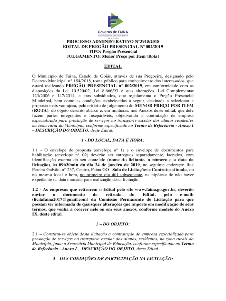 Governo de FAINA UM NOVO CAMINHO, UMA NOVA HISTRIA Adm 2017 2020PROCESSO ADMINISTRATIVO N3915/2018 EDITAL DE PREGO PRESENCIAL N 002/2019 TIPO: Prego Presencial JULGAMENTO: Menor Preo por Item (Rota)