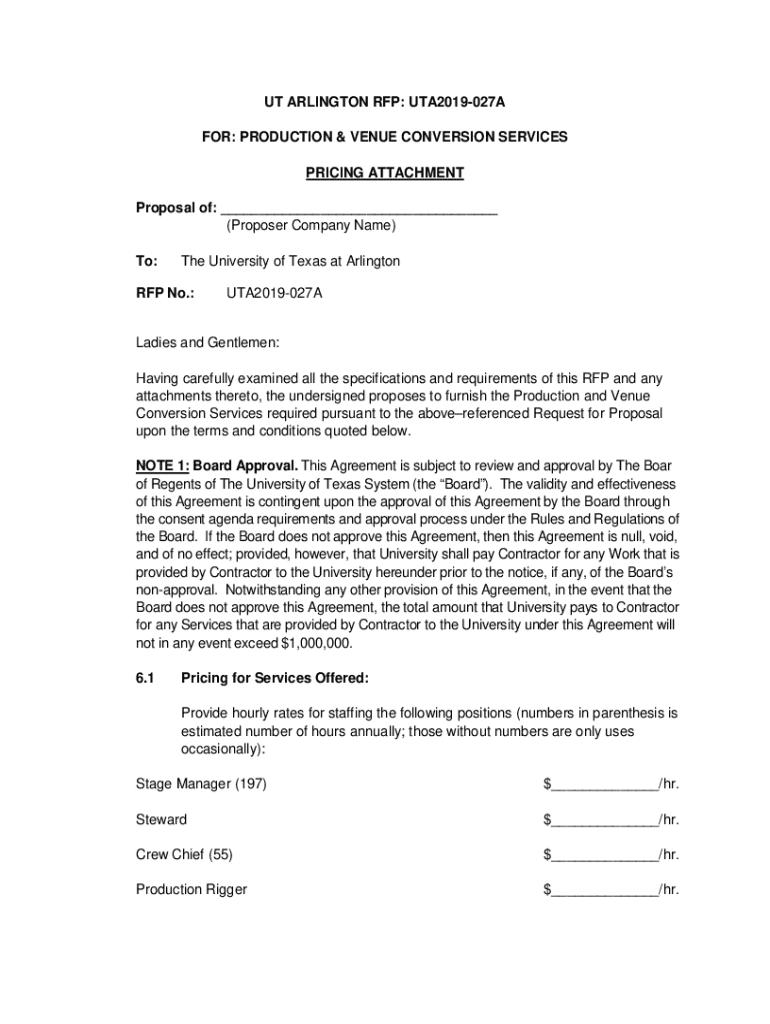 This document is a Request for Proposal (RFP) issued by the University of Texas at Arlington for Production and Venue Conversion Services. It includes detailed pricing attachments, positions that require staffing, payment terms, and conditions regarding board approval. Proposers are to submit their proposals based on the outlined terms, including potential revenue-generating initiatives and discounts for prompt payments.