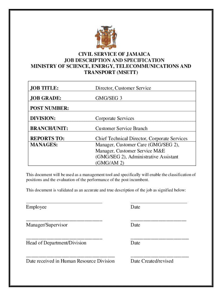 This document outlines the job description and specifications for the position of Director, Customer Service in the Ministry of Science, Energy, Telecommunications and Transport. It includes responsibilities for managing customer service initiatives, developing policies and programs, and ensuring quality service delivery across the Ministry and its agencies.